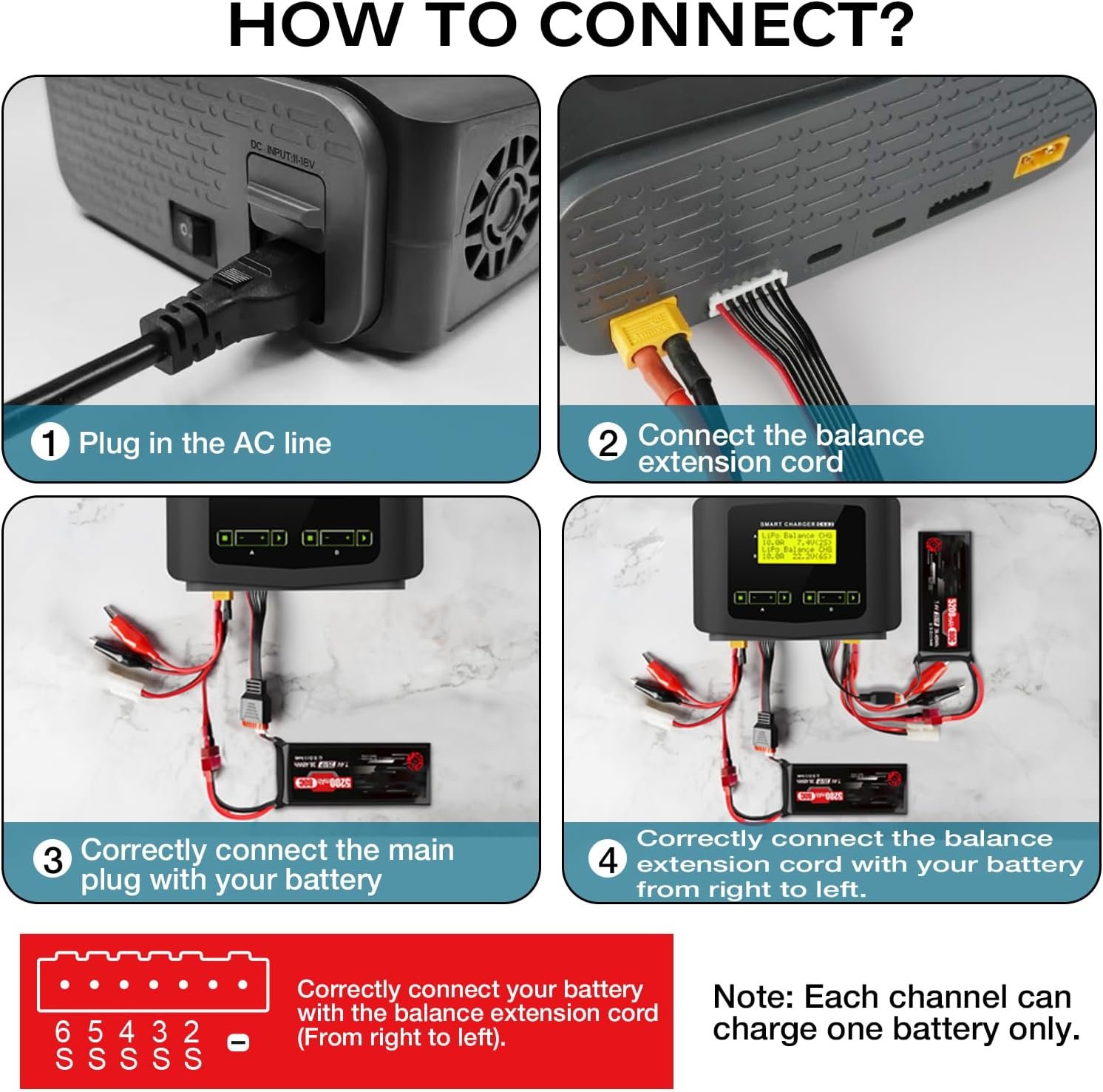 • Supported Battery Cell Counts: LiPo/ LiHV/ Li‑ion/ LiFe: 1‑6 S, NiCd/ NiMH: 1‑15 S, Pb: 2‑20 V